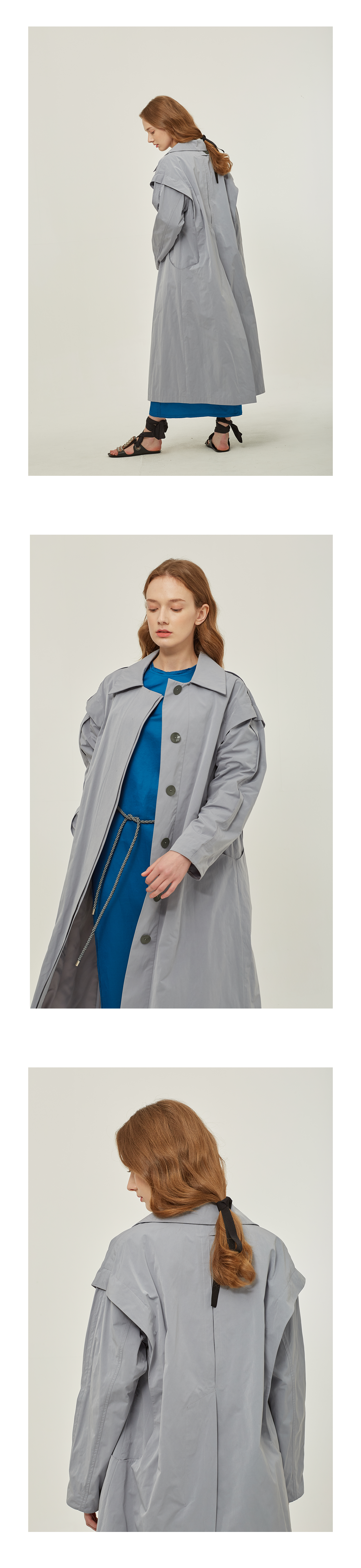 - 숄더라인에 턱을 잡아 베스트을 입은 듯한 디테일이 있는 트렌치