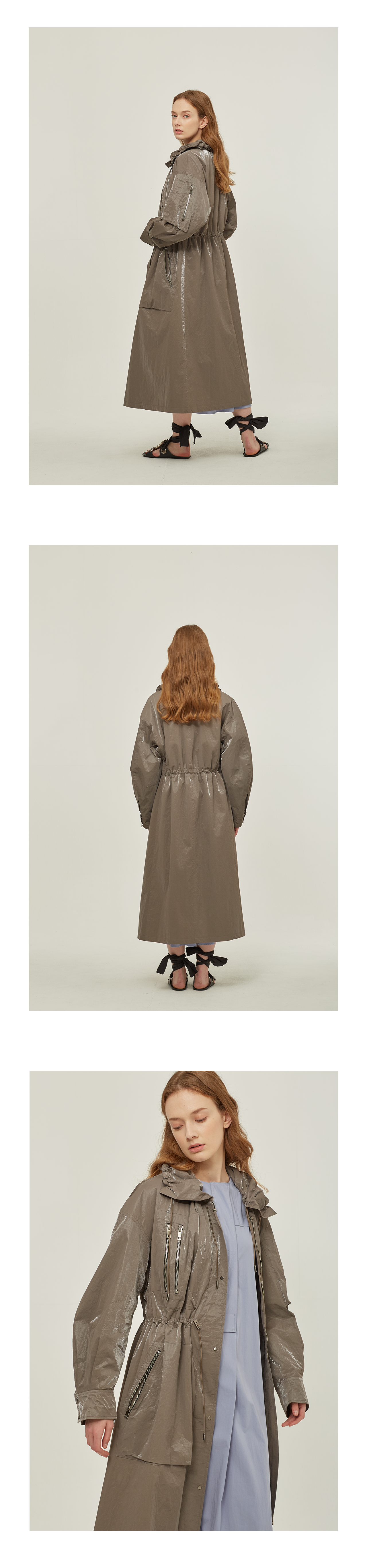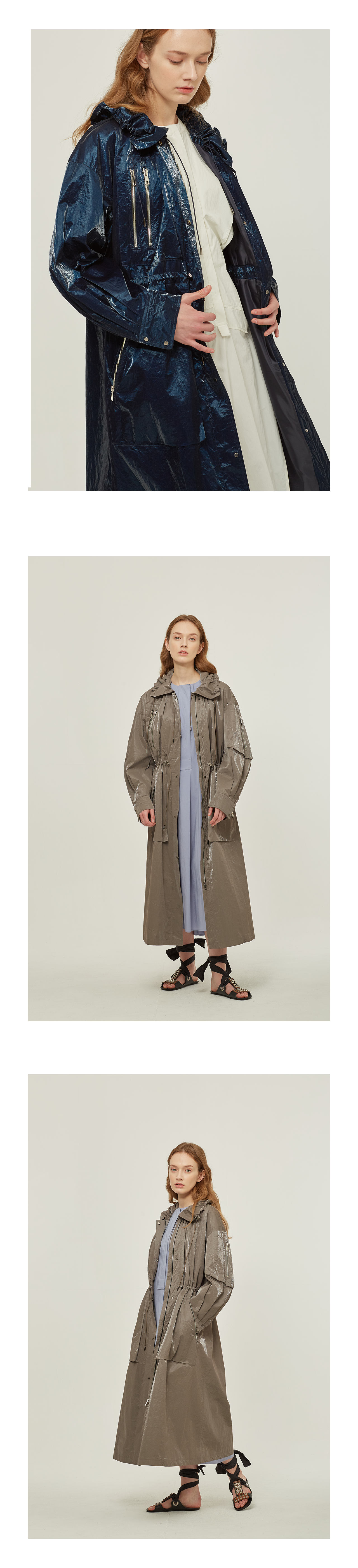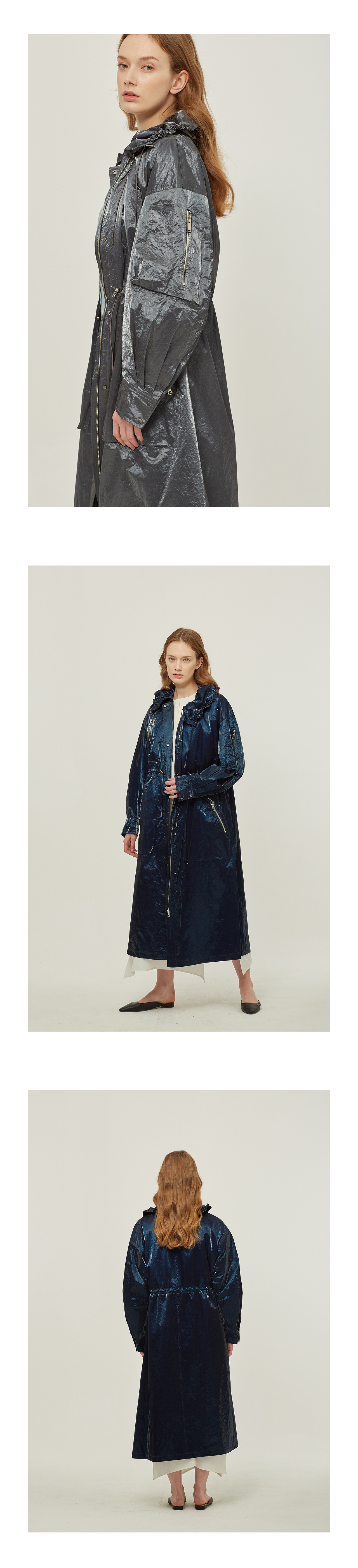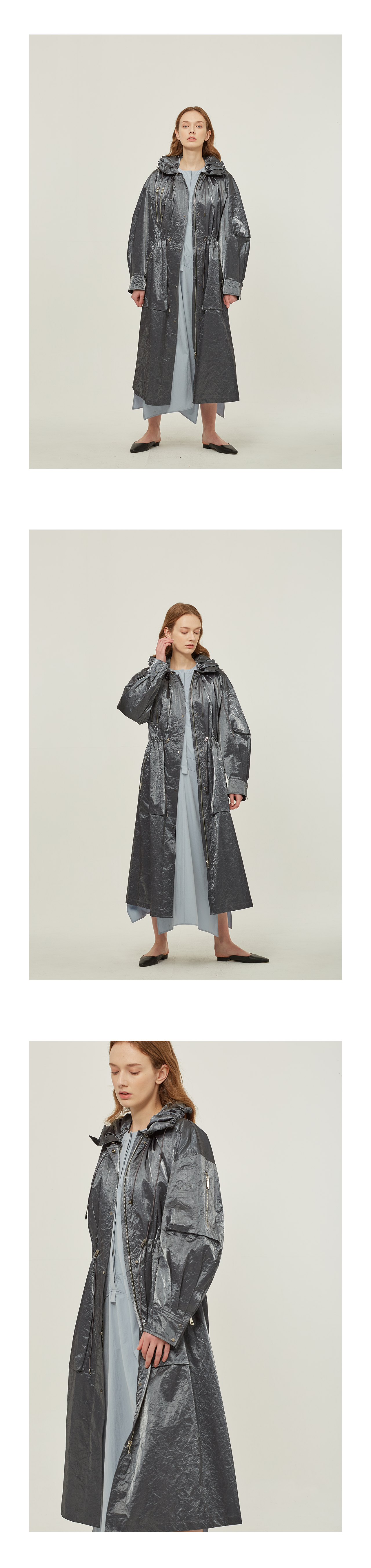 크리스피한 소재의 광택감이 있는 오버사이즈 실루엣의 코트