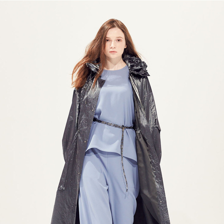 크리스피 한 소재의 광택감이 있는 오버사이즈 실루엣의 코트