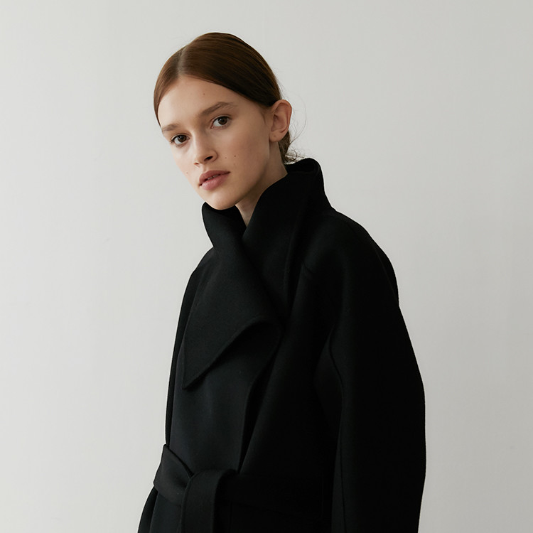 부드러운 터치감, 은은한 광택이 돋보이는 고급 울소재의 언밸런스 카라 라인 디테일의 코트