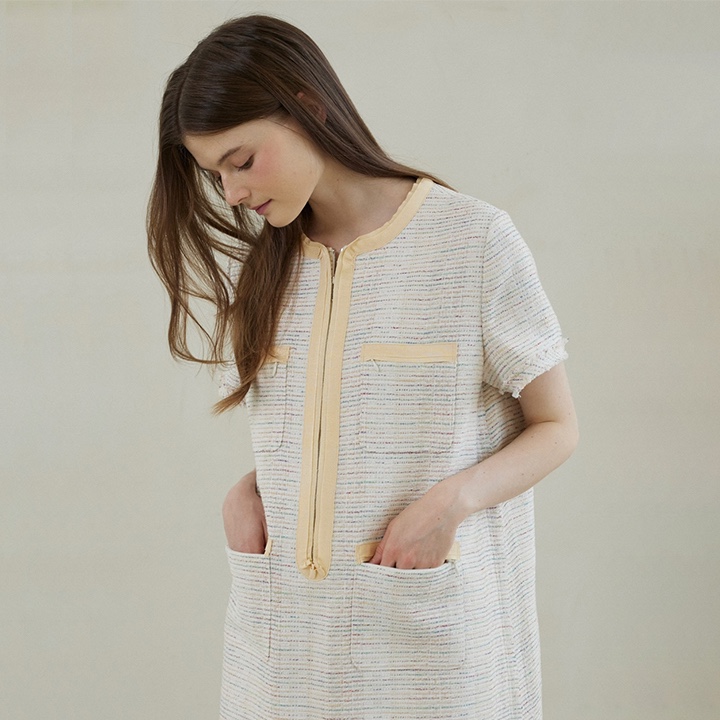 네크라인과 포켓을따라 포셉 시그니처 리본테잎으로 포인트를 준 감도높은 트위드 소재의 드레스